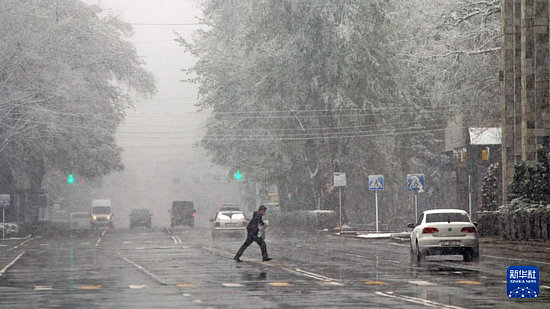 3月28日,在吉爾吉斯斯坦首都比什凱克,一名行人在強風(fēng)中穿過馬路。新華社發(fā)(羅曼攝)