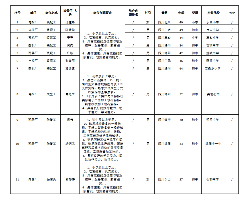 根據(jù)四川長虹空調(diào)有限公司發(fā)布的招聘公告及招聘相關(guān)規(guī)定,經(jīng)筆試、面試、考察、體檢等程序,擬錄用以下人員到長虹空調(diào)工作,現(xiàn)予以公示,具體情況如下: