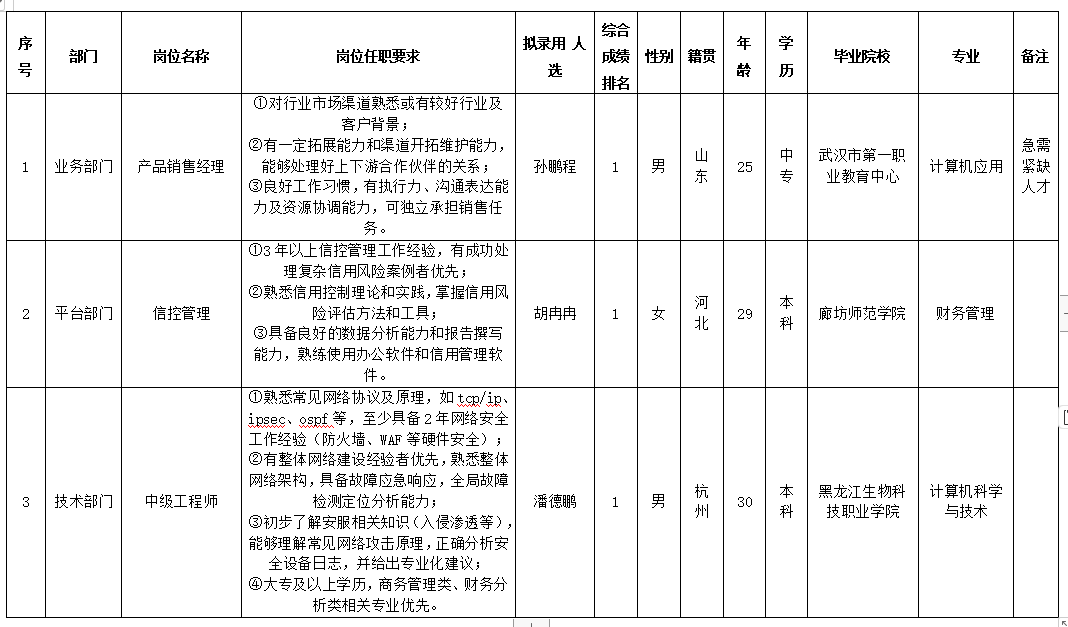 根據(jù)四川長虹佳華信息產(chǎn)品有限責(zé)任公司發(fā)布的招聘公告及招聘相關(guān)規(guī)定,經(jīng)面試、考察、體檢等程序,擬錄用孫鵬程、胡冉冉、潘德鵬同志到四川長虹佳華信息產(chǎn)品有限責(zé)任公司工作,現(xiàn)予以公示,具體情況如下: