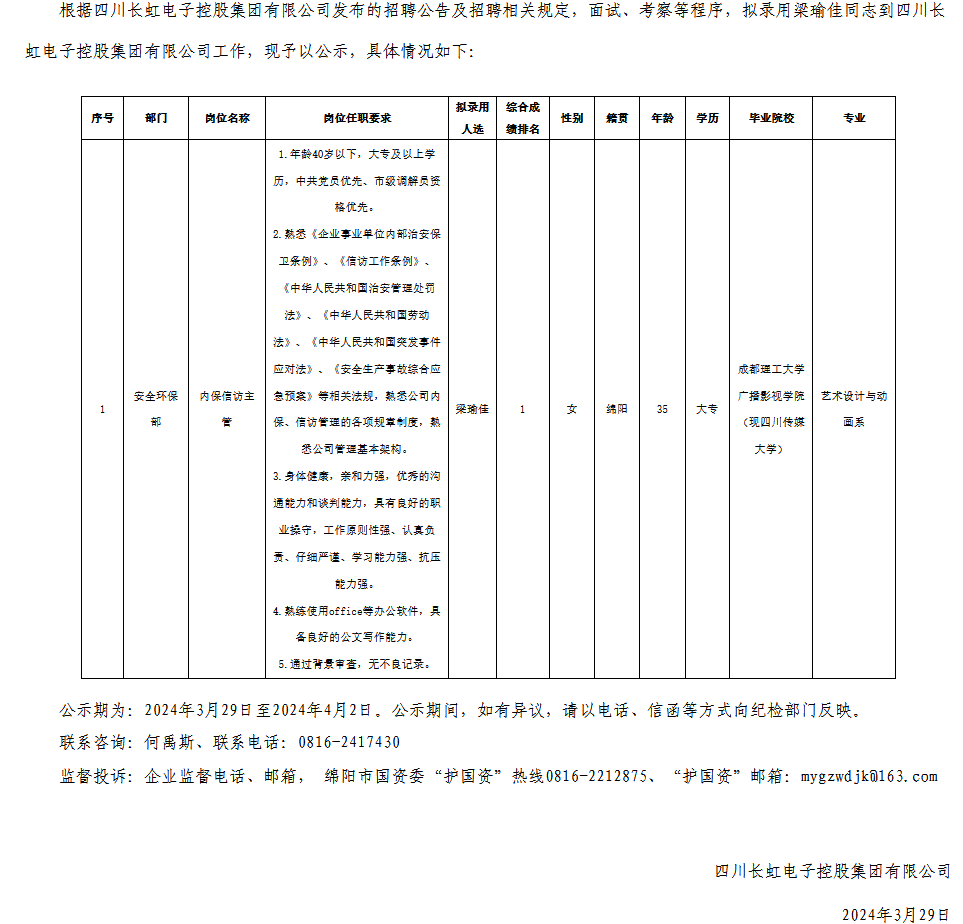 四川長(zhǎng)虹電子控股集團(tuán)有限公司關(guān)于招聘內(nèi)保信訪主管擬錄用人員的公示