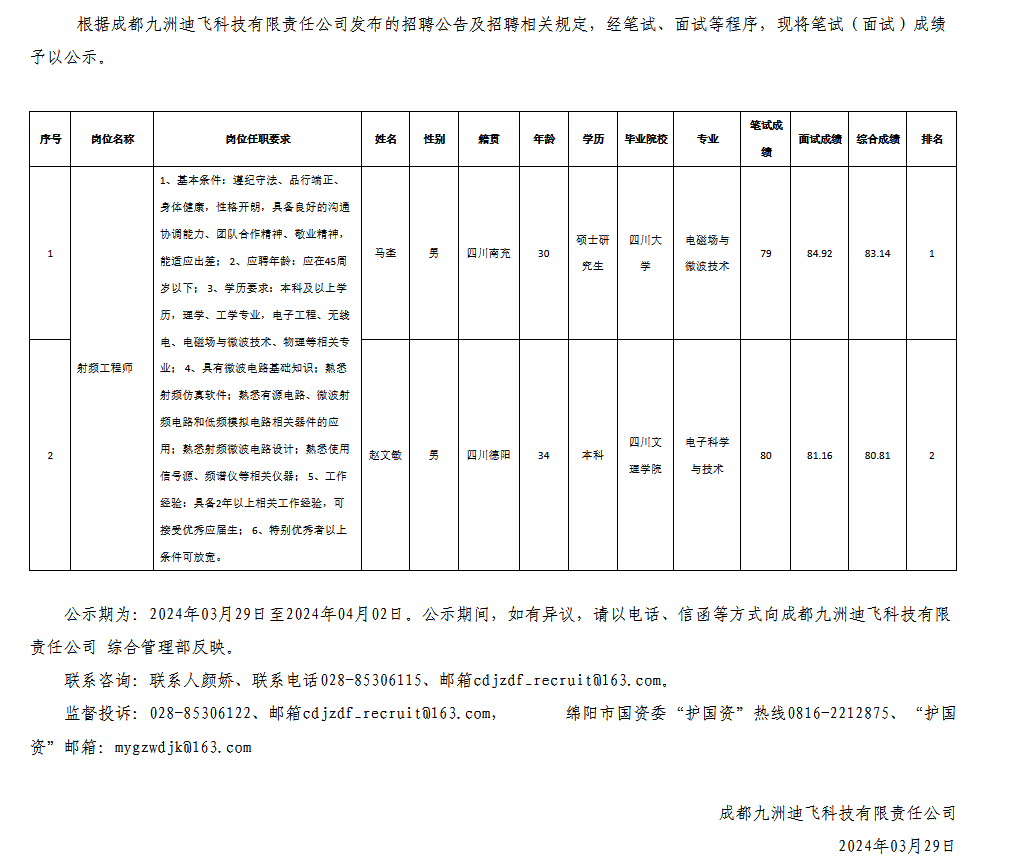 成都九洲迪飛科技有限責任公司關(guān)于招聘射頻工程師崗位測試成績的公示