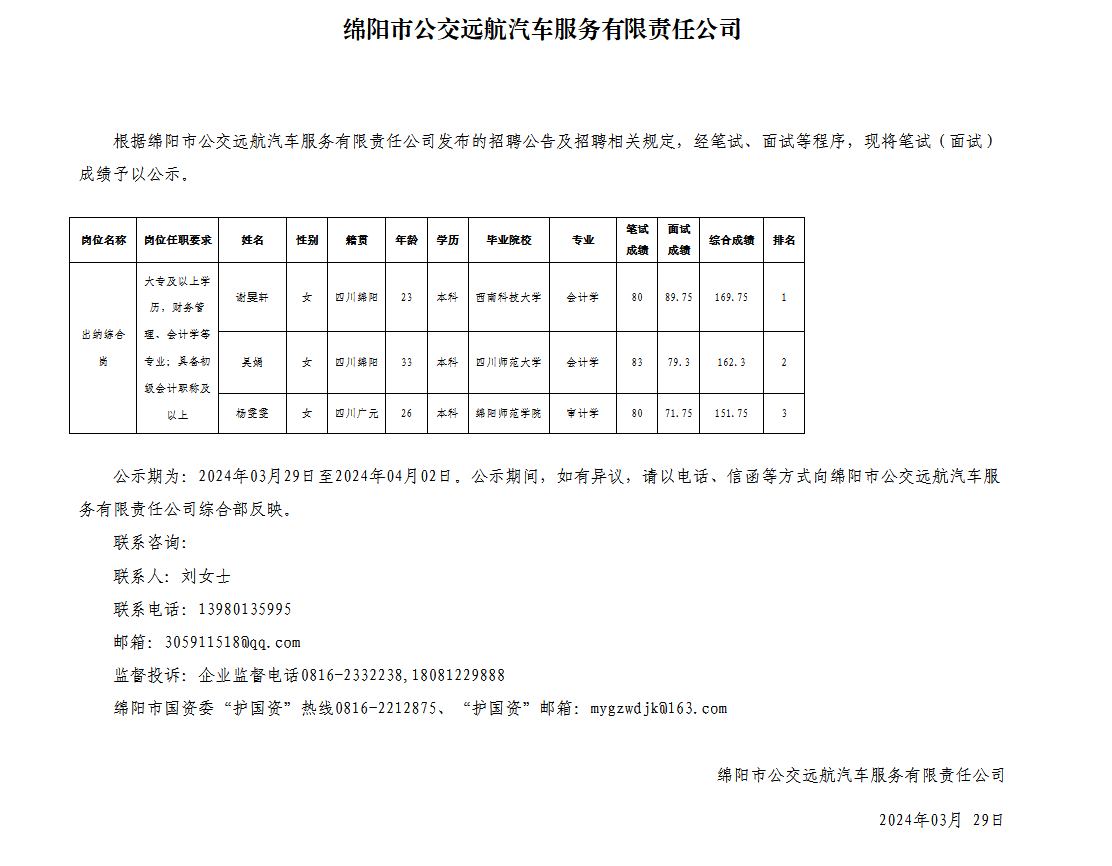 關(guān)于招聘出納綜合崗位測試成績的公示