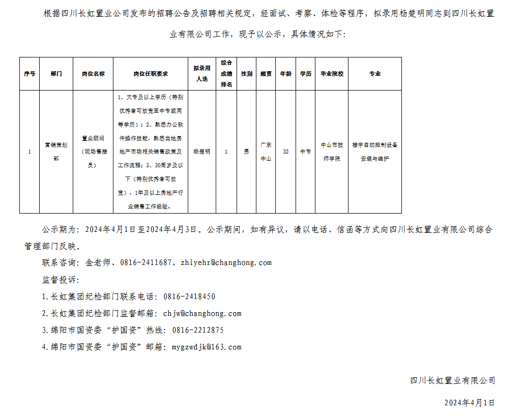 四川長(zhǎng)虹置業(yè)有限公司關(guān)于招聘置業(yè)顧問(wèn)(現(xiàn)場(chǎng)售樓員)擬錄用人員的公示