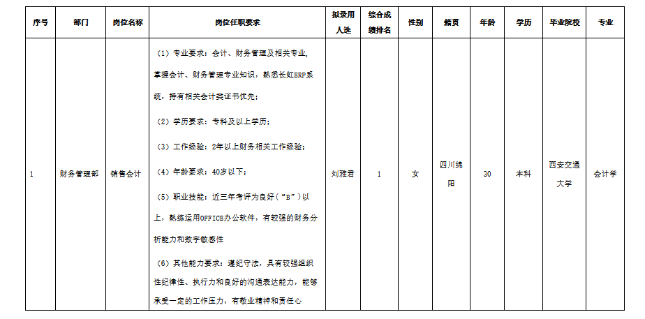 根據(jù)四川愛創(chuàng)科技有限公司發(fā)布的招聘公告及招聘相關(guān)規(guī)定,經(jīng)面試、考察、體檢等程序,擬錄用劉雅君同志到財務(wù)管理部工作,現(xiàn)予以公示,具體情況如下: