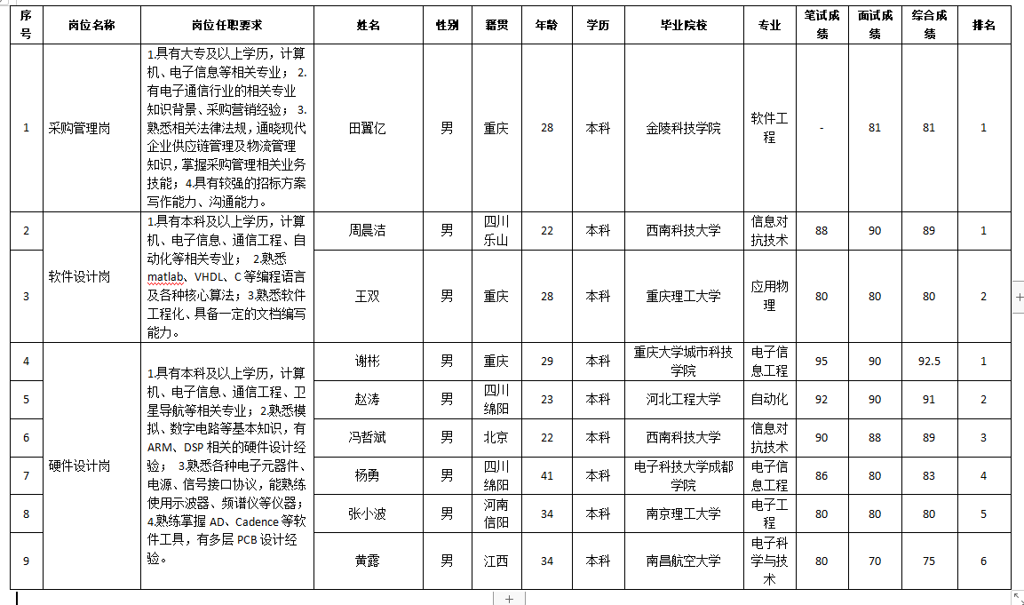 根據(jù)重慶九州星熠導(dǎo)航設(shè)備有限公司發(fā)布的招聘公告及招聘相關(guān)規(guī)定,經(jīng)筆試、面試等程序,現(xiàn)將筆試(面試)成績予以公示。