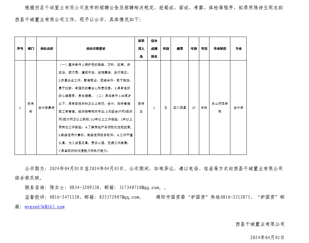 西昌千城置業(yè)有限公司關(guān)于招聘會計核算崗擬錄用人員的公示