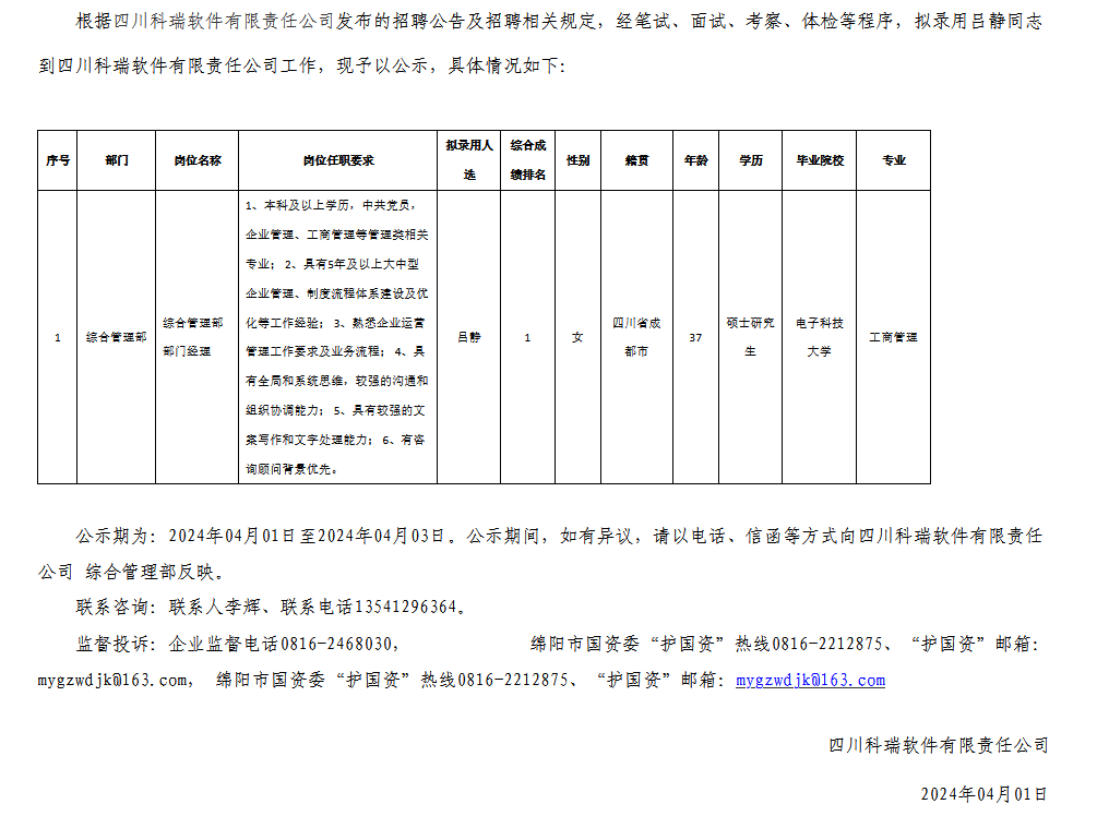 四川科瑞軟件有限責(zé)任公司關(guān)于招聘綜合管理部部門經(jīng)理擬錄用人員的公示