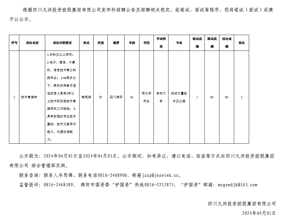 四川九洲投資控股集團(tuán)有限公司關(guān)于招聘技術(shù)管理崗測試成績的公示