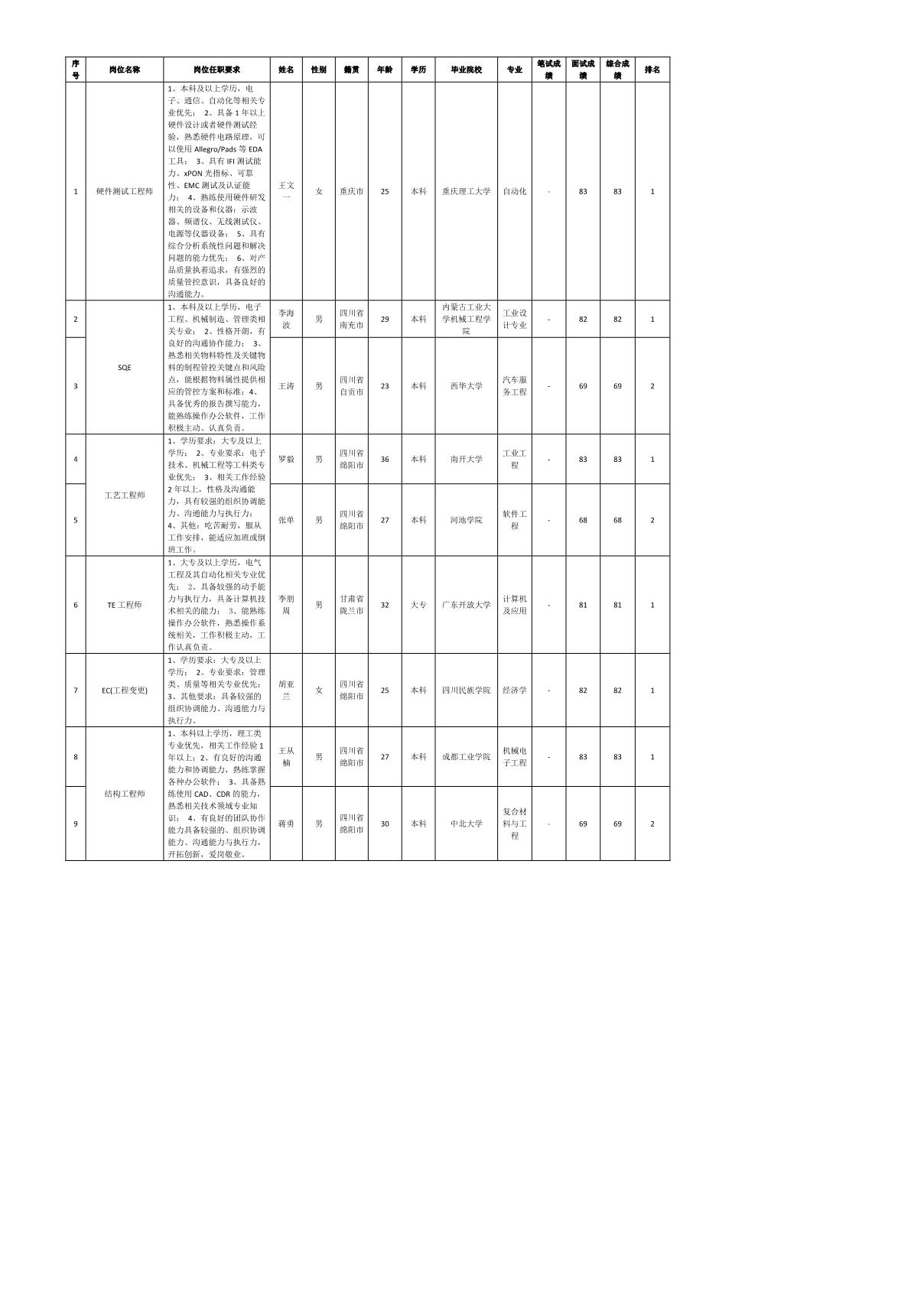 根據(jù)四川九州電子科技股份有限公司發(fā)布的招聘公告及招聘相關(guān)規(guī)定,經(jīng)筆試、面試等程序,現(xiàn)將筆試(面試)成績予以公示。