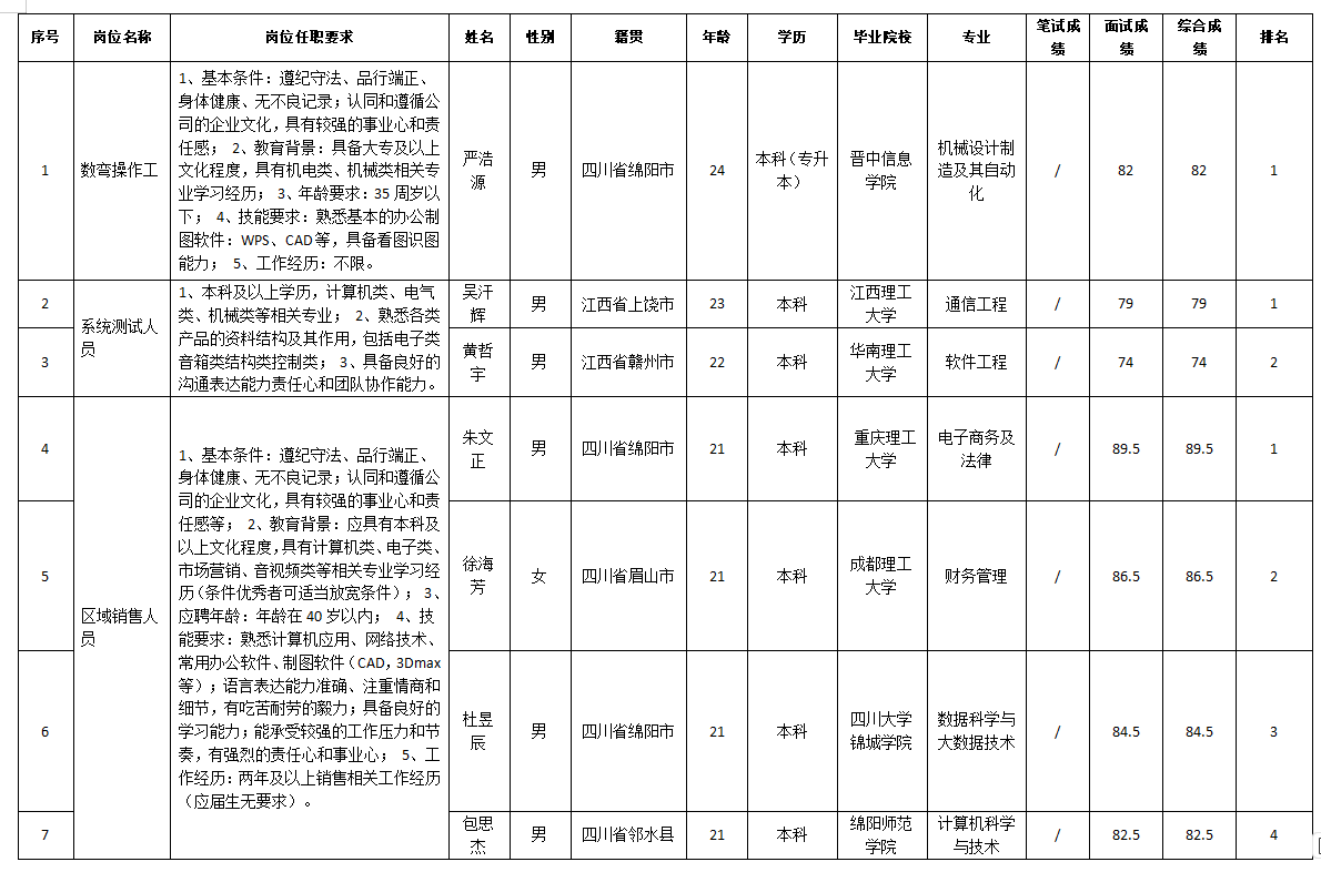 根據(jù)四川湖山電器股份有限公司發(fā)布的招聘公告及招聘相關(guān)規(guī)定,經(jīng)筆試、面試等程序,現(xiàn)將筆試(面試)成績予以公示。