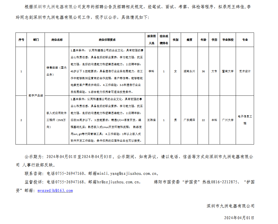 深圳市九洲電器有限公司關(guān)于招聘嵌入式應(yīng)用軟件工程師等崗位擬錄用人員的公示