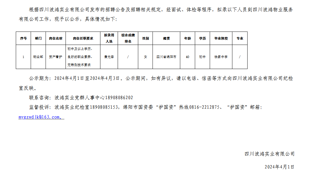 四川波鴻實業(yè)有限公司關于招聘四川波鴻物業(yè)服務有限公司資產(chǎn)看護擬錄用人員的公示