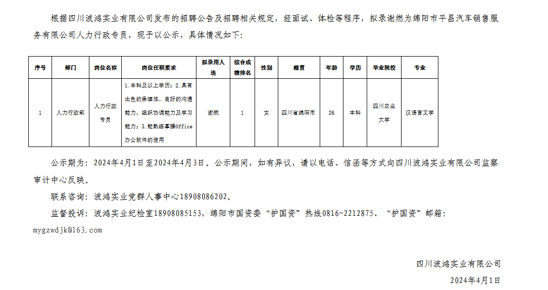 四川波鴻實(shí)業(yè)有限公司關(guān)于招聘綿陽(yáng)市平昌汽車銷售服務(wù)有限公司人力行政專員擬錄用人員的公示