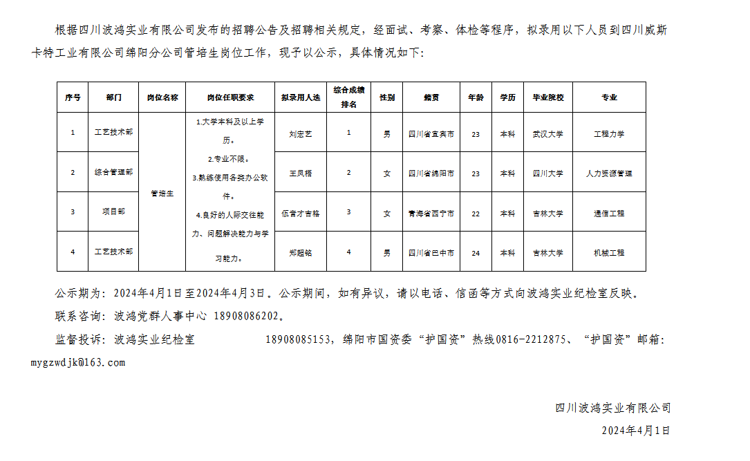 四川波鴻實業(yè)有限公司關(guān)于招聘四川威斯卡特工業(yè)有限公司綿陽分公司管培生擬錄用人員的公示