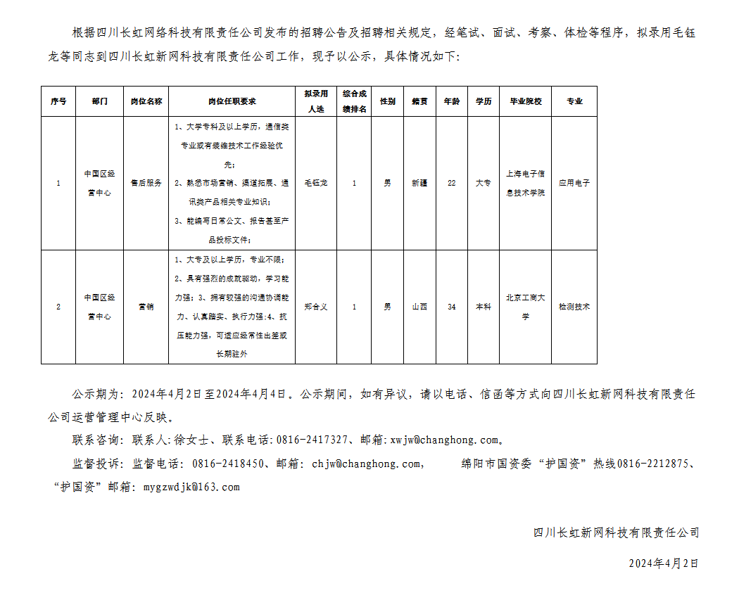 四川長虹新網(wǎng)科技有限責(zé)任公司關(guān)于招聘售后服務(wù)等崗位擬錄用人員的公示