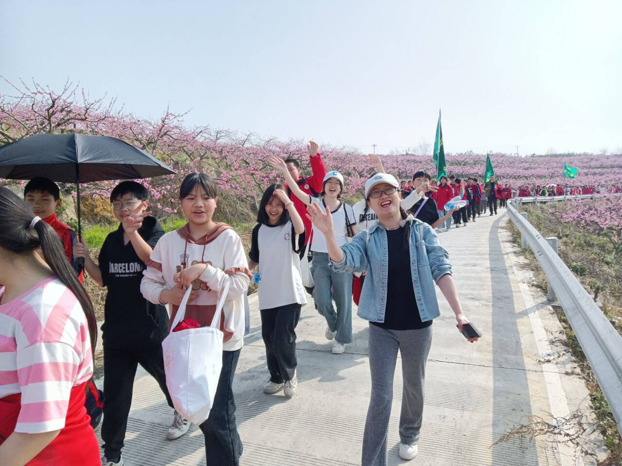 一路上,師生們行走在塔水七里村油菜花與桃花盛開的田野里,賞花,聽風(fēng),聞香,恰似去赴一場(chǎng)春天的盛會(huì);領(lǐng)略家鄉(xiāng)美景,感悟家鄉(xiāng)祖國(guó)變化;撿拾垃圾,用行動(dòng)踐行環(huán)保理念;相互幫助,相互鼓勵(lì),彰顯班級(jí)凝聚力;師生互動(dòng),歡聲笑語(yǔ),構(gòu)成一幅幅和諧美景……