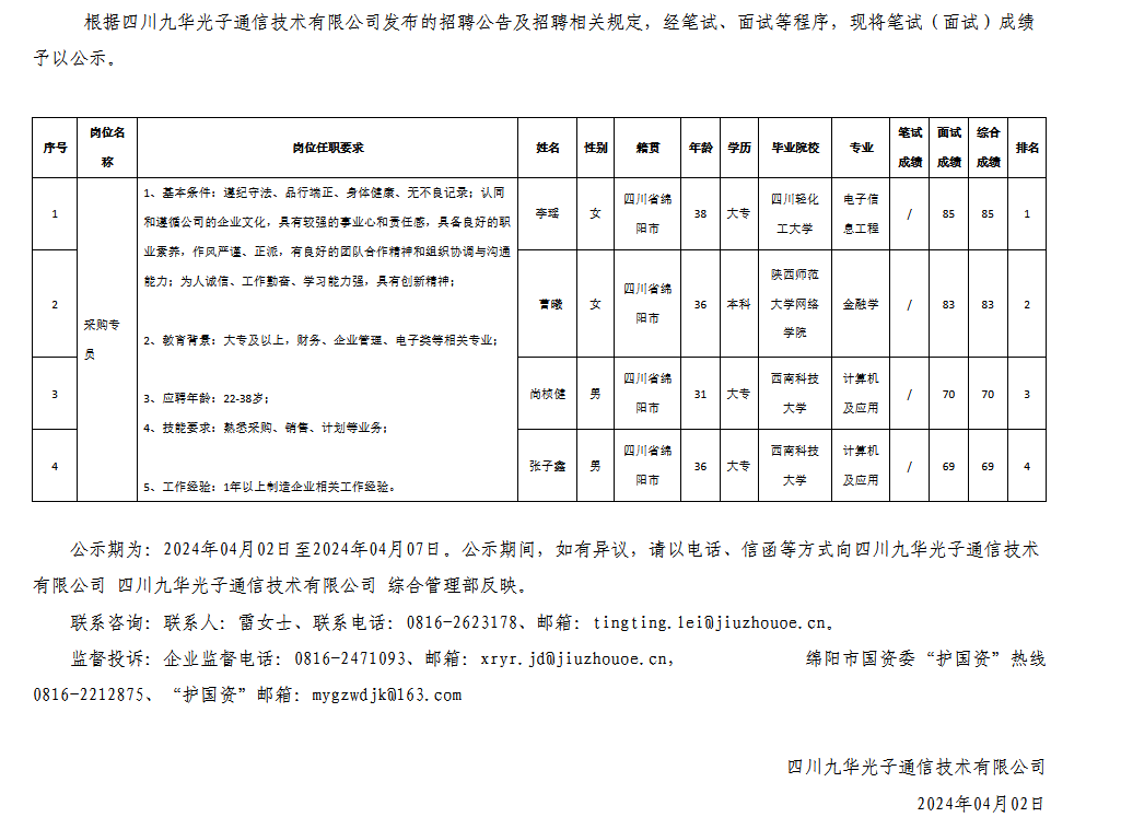 四川九華光子通信技術有限公司關于招聘采購專員測試成績的公示