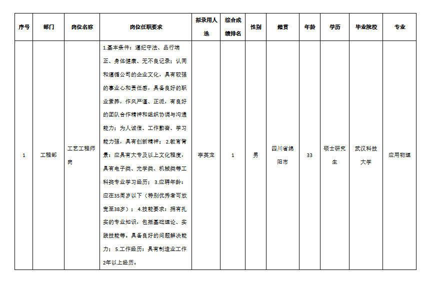 根據(jù)四川九華光子通信技術(shù)有限公司發(fā)布的招聘公告及招聘相關(guān)規(guī)定,經(jīng)筆試、面試、考察、體檢等程序,擬錄用李英龍同志到四川九華光子通信技術(shù)有限公司工作,現(xiàn)予以公示,具體情況如下: