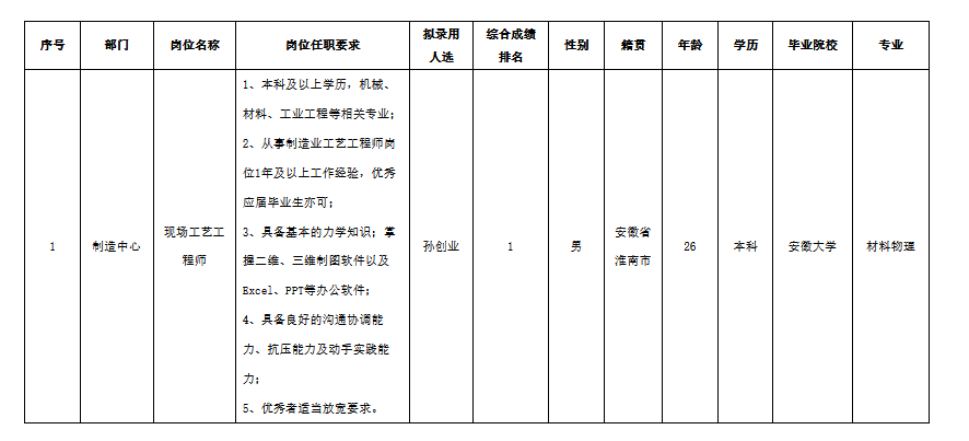 根據(jù)中科美菱低溫科技股份有限公司(以下簡(jiǎn)稱“中科美菱”)發(fā)布的招聘公告及招聘相關(guān)規(guī)定,經(jīng)筆試、面試、考察、體檢等程序,擬錄用孫創(chuàng)業(yè)同志到中科美菱工作,現(xiàn)予以公示,具體情況如下: