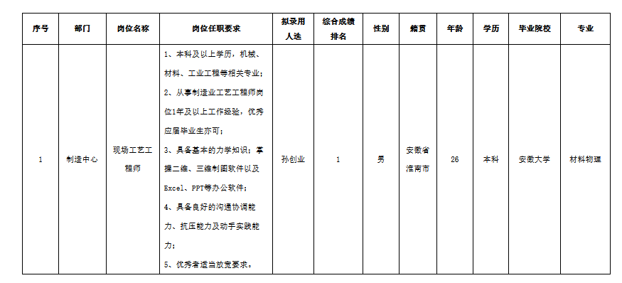 根據(jù)中科美菱低溫科技股份有限公司(以下簡稱“中科美菱”)發(fā)布的招聘公告及招聘相關規(guī)定,經(jīng)筆試、面試、考察、體檢等程序,擬錄用孫創(chuàng)業(yè)同志到中科美菱工作,現(xiàn)予以公示,具體情況如下: