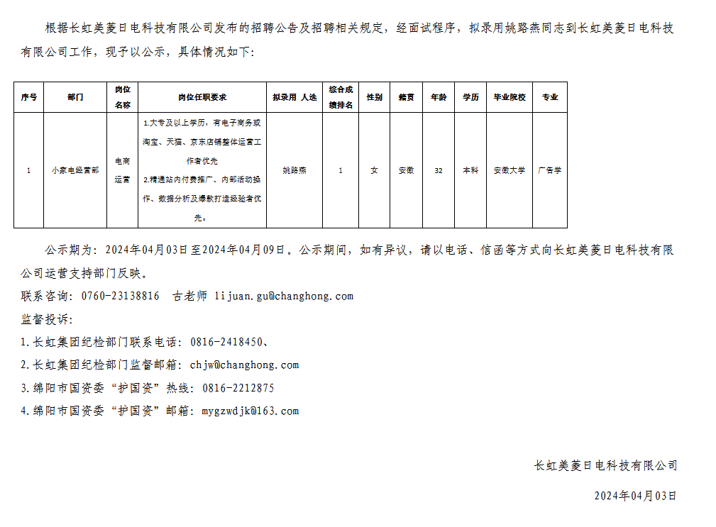 長(zhǎng)虹美菱日電科技有限公司關(guān)于招聘電商運(yùn)營(yíng)崗位擬錄用人員的公示