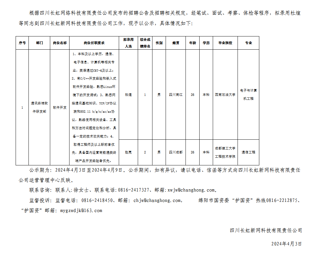 四川長虹新網(wǎng)科技有限責任公司關(guān)于招聘軟件開發(fā)等崗位擬錄用人員的公示