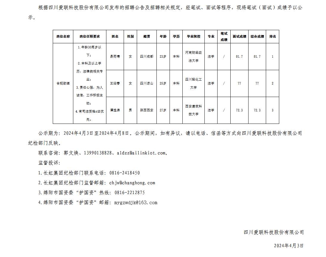 四川愛聯(lián)科技股份有限公司關(guān)于招聘合規(guī)助理崗位測(cè)試成績的公示