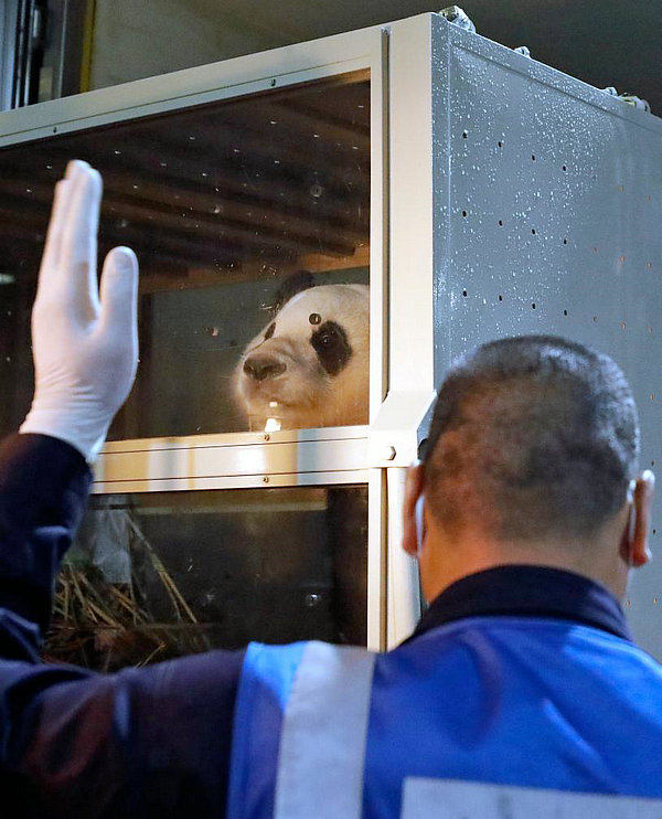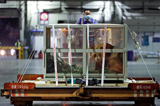 4月3日晚,旅韓大熊貓“福寶”搭乘專機(jī)抵達(dá)成都雙流國(guó)際機(jī)場(chǎng)后,準(zhǔn)備乘車(chē)前往中國(guó)大熊貓保護(hù)研究中心臥龍神樹(shù)坪基地進(jìn)行隔離檢疫。新華社記者 沈伯韓 攝