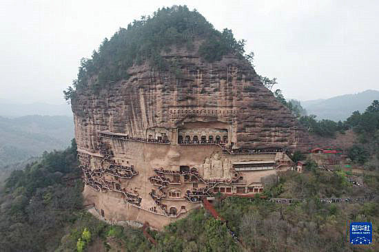4月5日,游客在位于天水市麥積區(qū)的麥積山石窟游覽(無人機(jī)照片)。