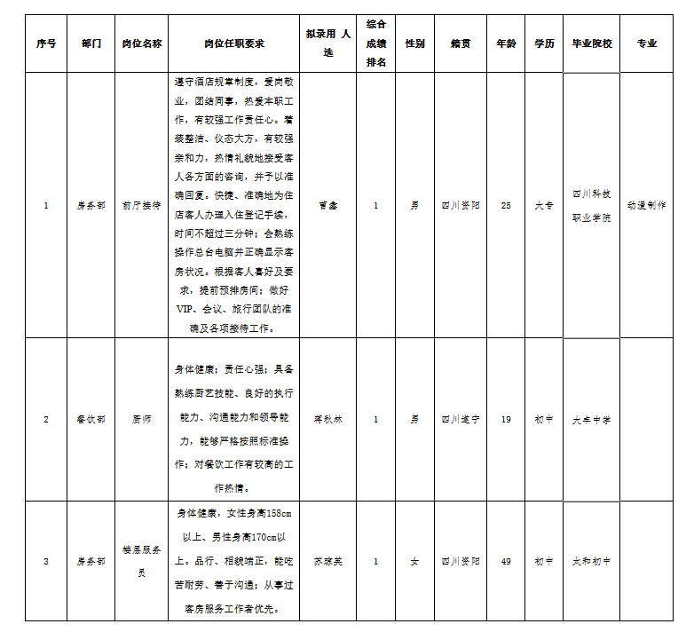 根據(jù)四川泰蒙斯酒店有限責(zé)任公司發(fā)布的招聘公告及招聘相關(guān)規(guī)定,經(jīng)筆試、面試、考察、體檢等程序,擬錄用曹鑫、蔣秋林、蘇瓊英等三位同志到泰蒙斯酒店工作,現(xiàn)予以公示,具體情況如下: