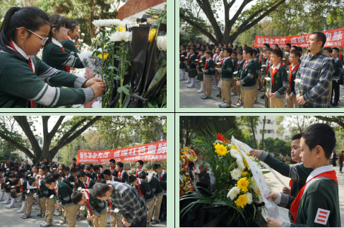 學(xué)生高舉隊(duì)旗,邁著整齊的步伐,心懷對烈士們的敬佩之情來到紀(jì)念碑前。莊嚴(yán)的祭掃儀式上,唱隊(duì)歌,敬獻(xiàn)花籃,師生集體默哀,表達(dá)了對先烈們的哀思和最崇高的敬意。
