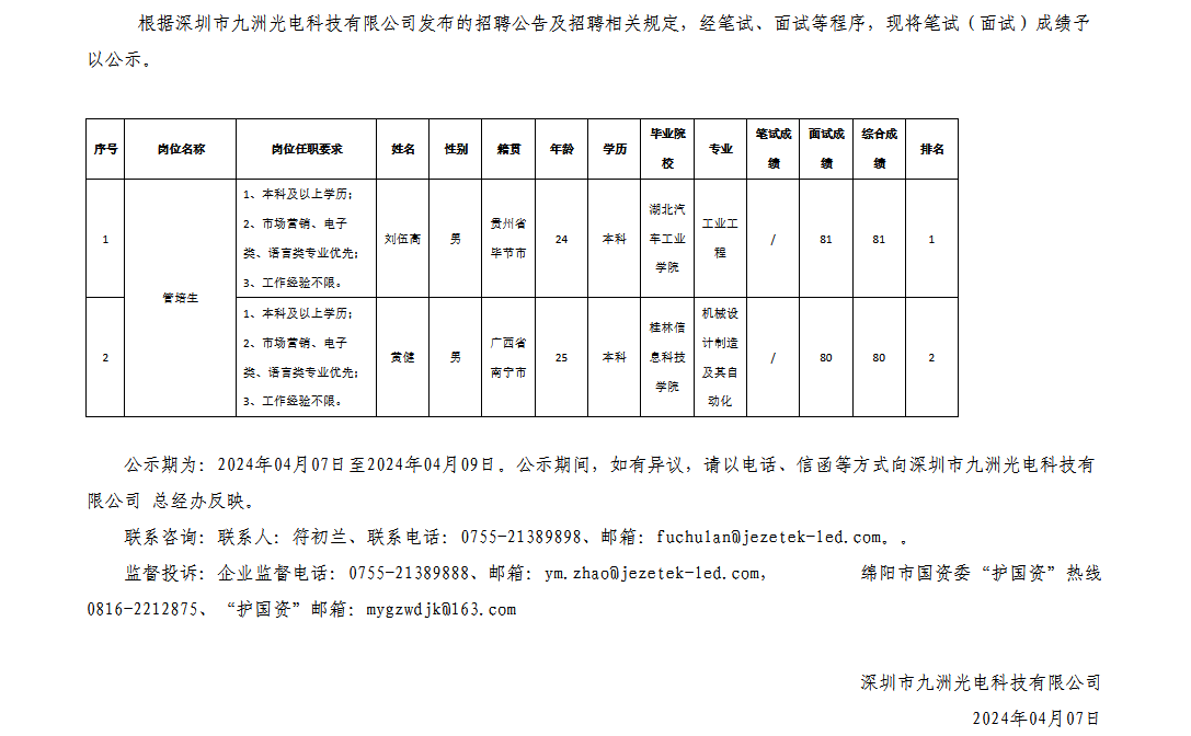 深圳市九洲光電科技有限公司關(guān)于招聘管培生崗位測(cè)試成績(jī)的公示