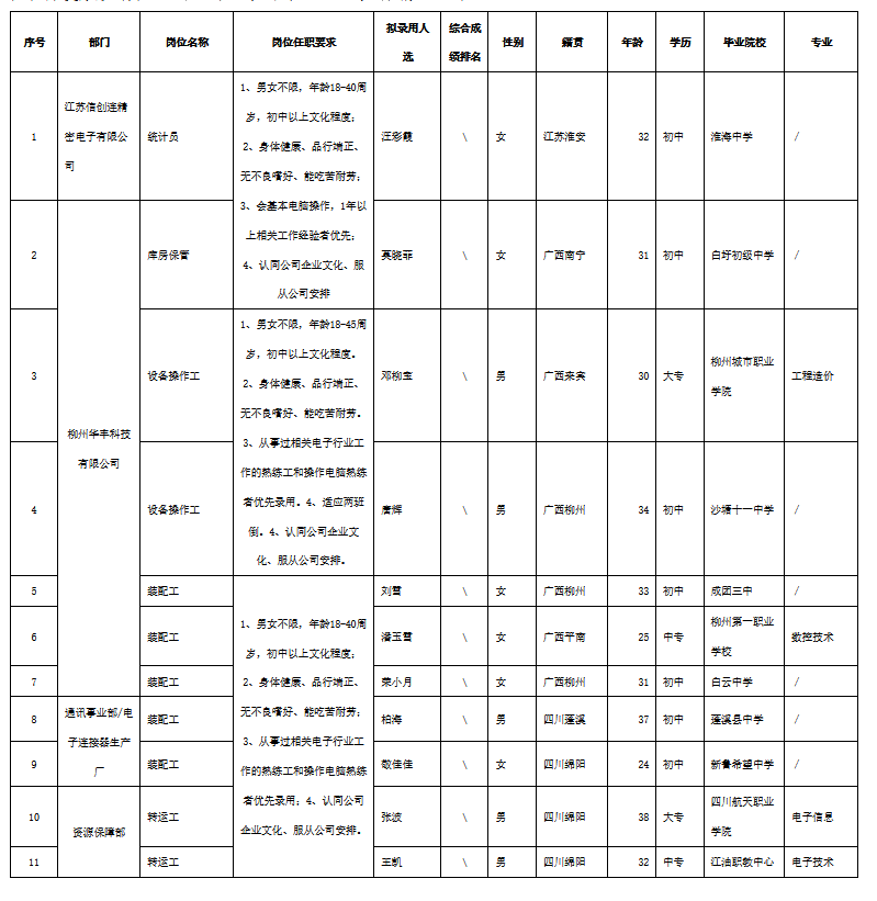 根據(jù)四川華豐科技股份有限公司發(fā)布的招聘公告及招聘相關(guān)規(guī)定,經(jīng)面試、考察、體檢等程序,擬錄用以下11人到四川華豐科技股份有限公司工作,現(xiàn)予以公示,具體情況如下: