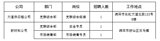 四川大道致遠(yuǎn)供應(yīng)鏈管理有限責(zé)任公司(以下簡稱大道供應(yīng)鏈公司)是綿陽交通發(fā)展集團(tuán)有限責(zé)任公司旗下全資子公司,成立于2021年1月,注冊資本2900萬元,業(yè)務(wù)范圍覆蓋建筑用鋼筋產(chǎn)品銷售、水泥銷售、石油制品銷售等。綿陽交發(fā)大道新材料科技有限責(zé)任公司(以下簡稱新材料公司)是大道供應(yīng)鏈公司旗下全資子公司,成立于2021年11月,主營業(yè)務(wù)為廢舊瀝青再生技術(shù)研發(fā)與瀝青砼生產(chǎn)貿(mào)易。現(xiàn)因公司經(jīng)營發(fā)展需要,經(jīng)研究決定面向社會公開招聘,具體招聘情況如下: