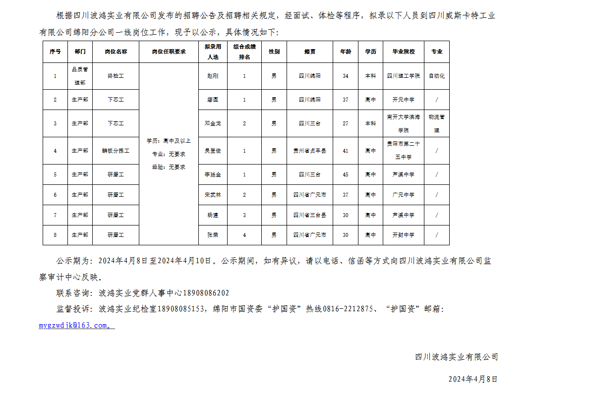四川波鴻實業(yè)有限公司關于3月招聘四川威斯卡特工業(yè)有限公司綿陽分公司一線崗位擬錄用人員的公示