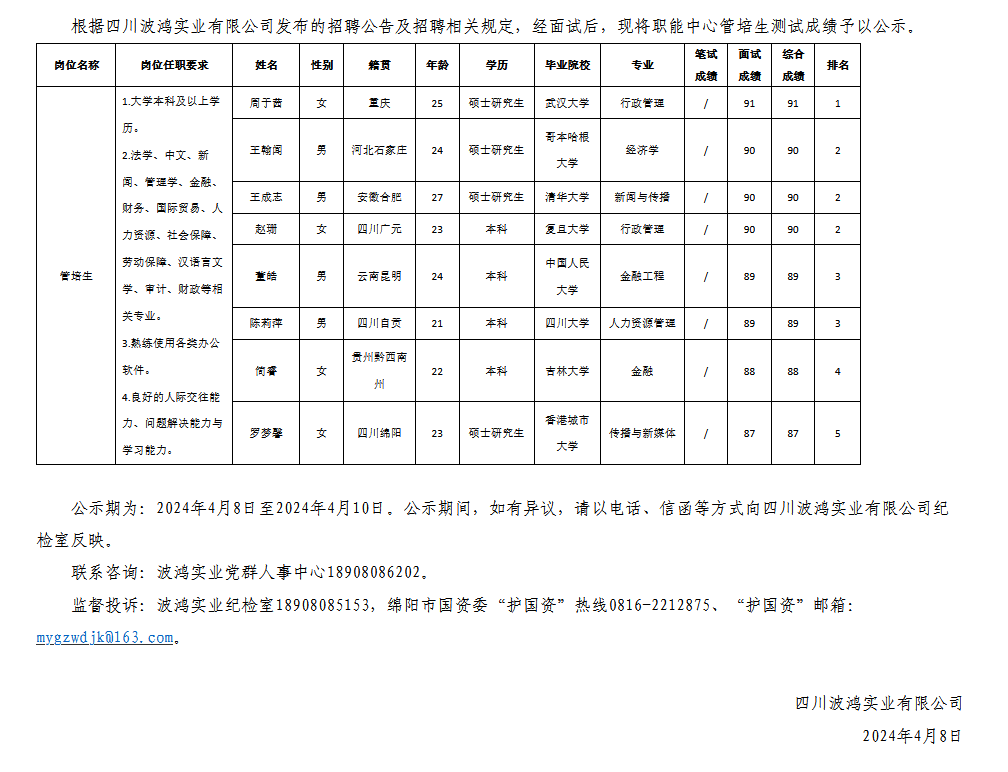 四川波鴻實業(yè)有限公司關(guān)于招聘職能中心管培生測試成績的公示