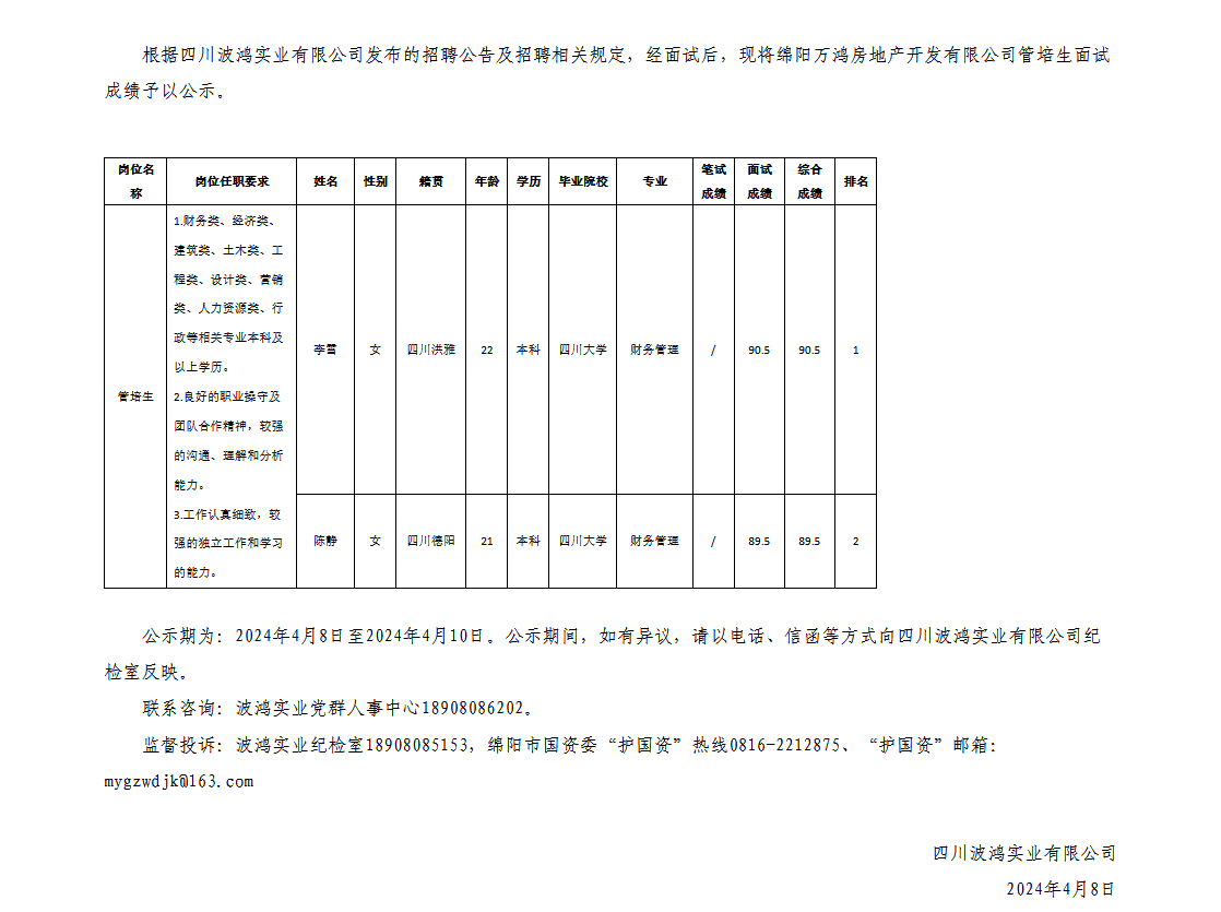 四川波鴻實(shí)業(yè)有限公司關(guān)于招聘綿陽萬鴻房地產(chǎn)開發(fā)有限公司管培生測試成績的公示