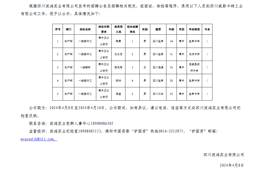 四川波鴻實(shí)業(yè)有限公司關(guān)于3月招聘四川威斯卡特工業(yè)有限公司一線(xiàn)崗位擬錄用人員的公示