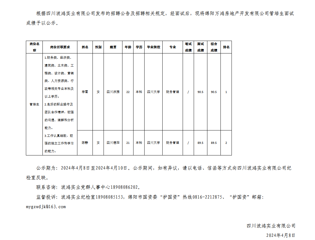 四川波鴻實(shí)業(yè)有限公司關(guān)于招聘綿陽萬鴻房地產(chǎn)開發(fā)有限公司管培生測試成績的公示