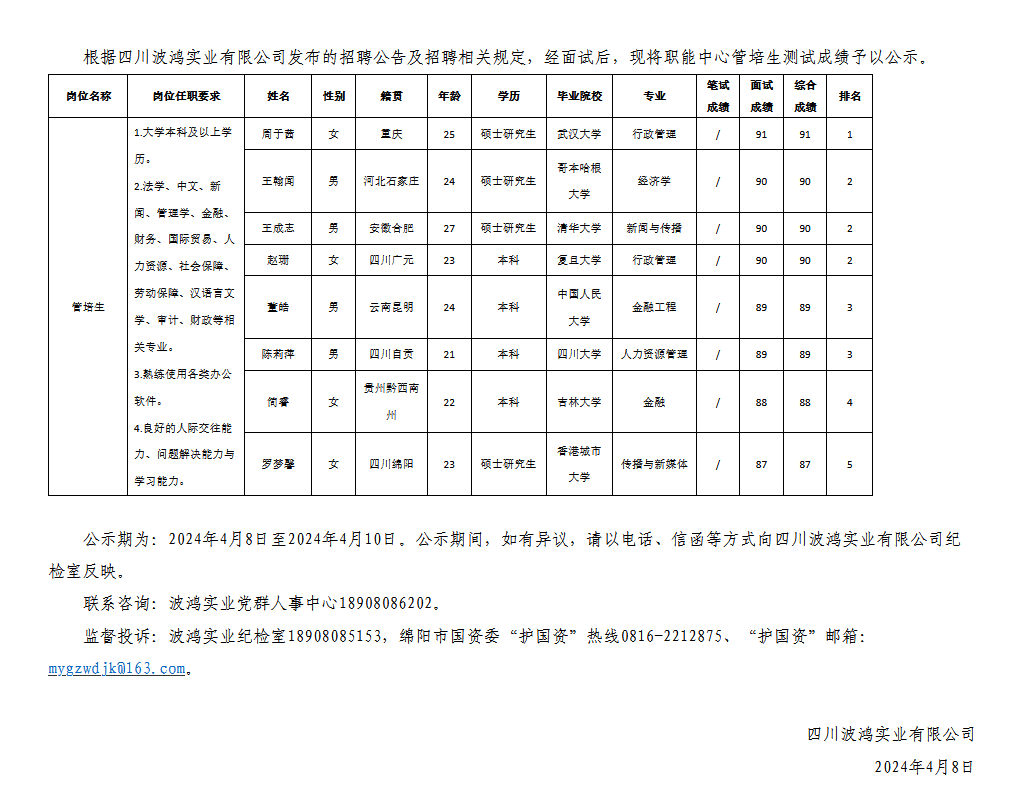 四川波鴻實(shí)業(yè)有限公司關(guān)于招聘職能中心管培生測(cè)試成績(jī)的公示