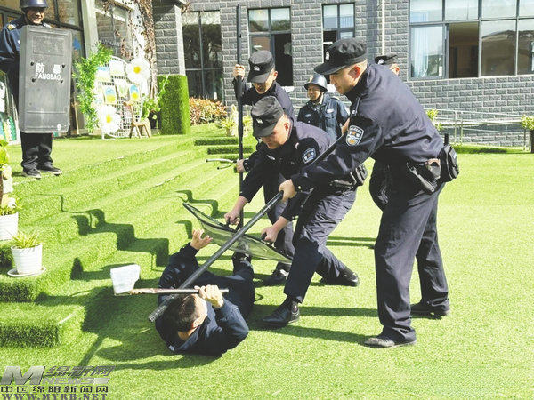 當(dāng)日上午10時(shí)開(kāi)始演練。“可疑人員”借給孩子送衣物的理由試圖闖入幼兒園。安保人員發(fā)現(xiàn)其神色慌張、形跡可疑,對(duì)其進(jìn)行阻攔,“歹徒”拿出“兇器”揮舞,安保人員利用鋼叉、護(hù)盾等防暴器械奮力抵抗。一名安保人員迅速向上級(jí)和派出所報(bào)案,請(qǐng)求支援。幼兒園通訊聯(lián)絡(luò)組第一時(shí)間通知全園師生有可疑人員闖入,啟動(dòng)幼兒園防恐防暴應(yīng)急預(yù)案。