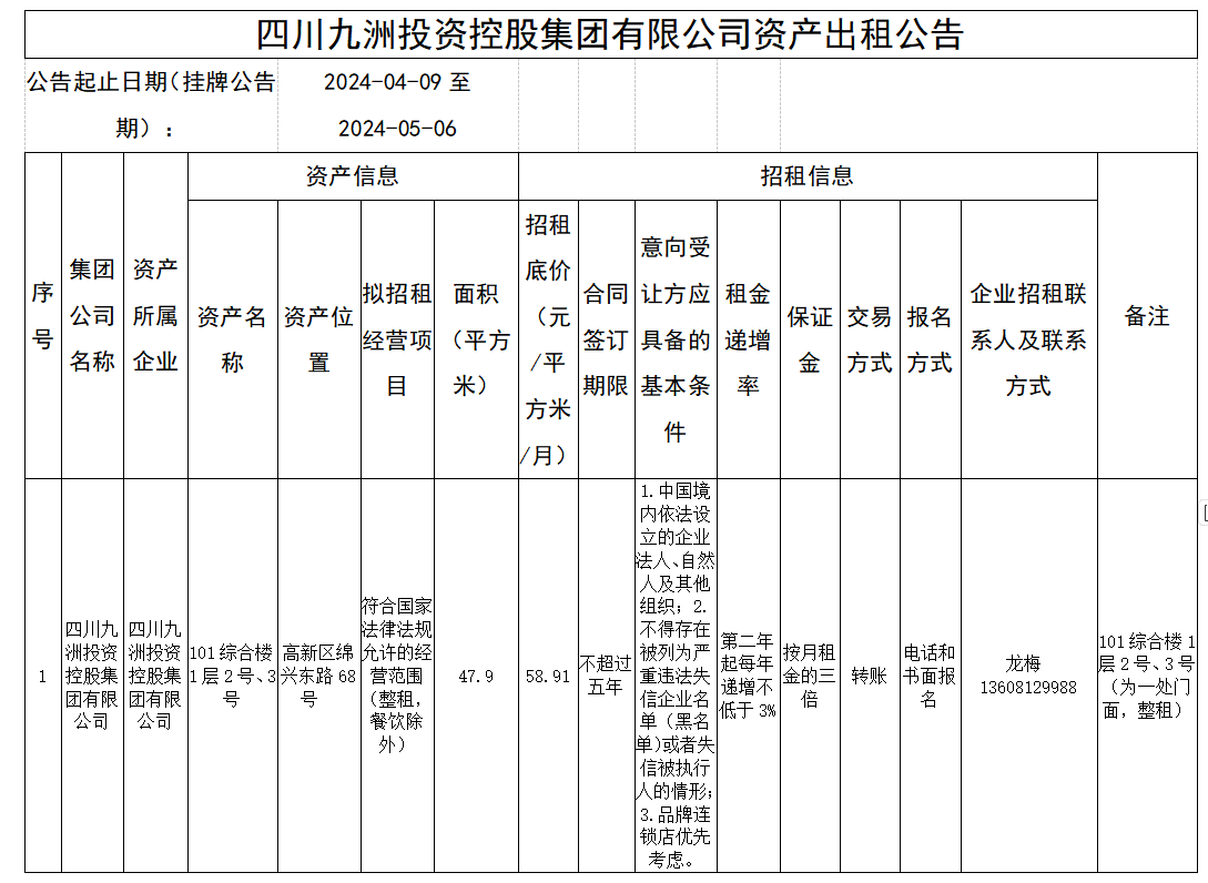 四川九洲投資控股集團(tuán)有限公司資產(chǎn)出租公告