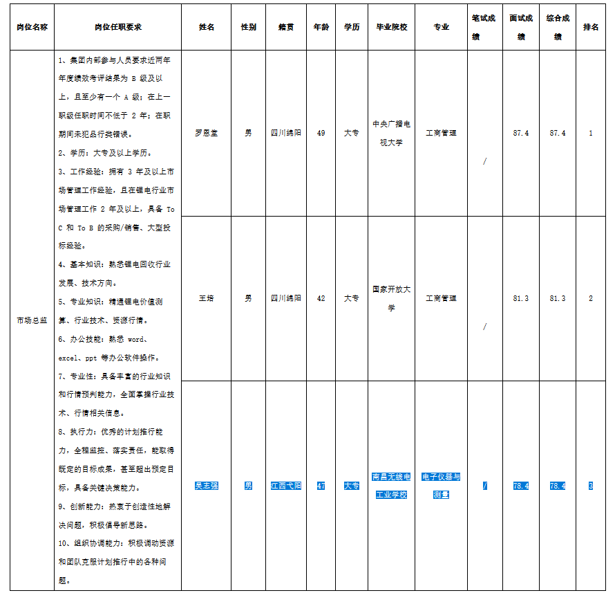 根據(jù)江西格潤(rùn)新材料有限公司發(fā)布的招聘公告及招聘相關(guān)規(guī)定,經(jīng)面試程序,現(xiàn)將面試成績(jī)予以公示。