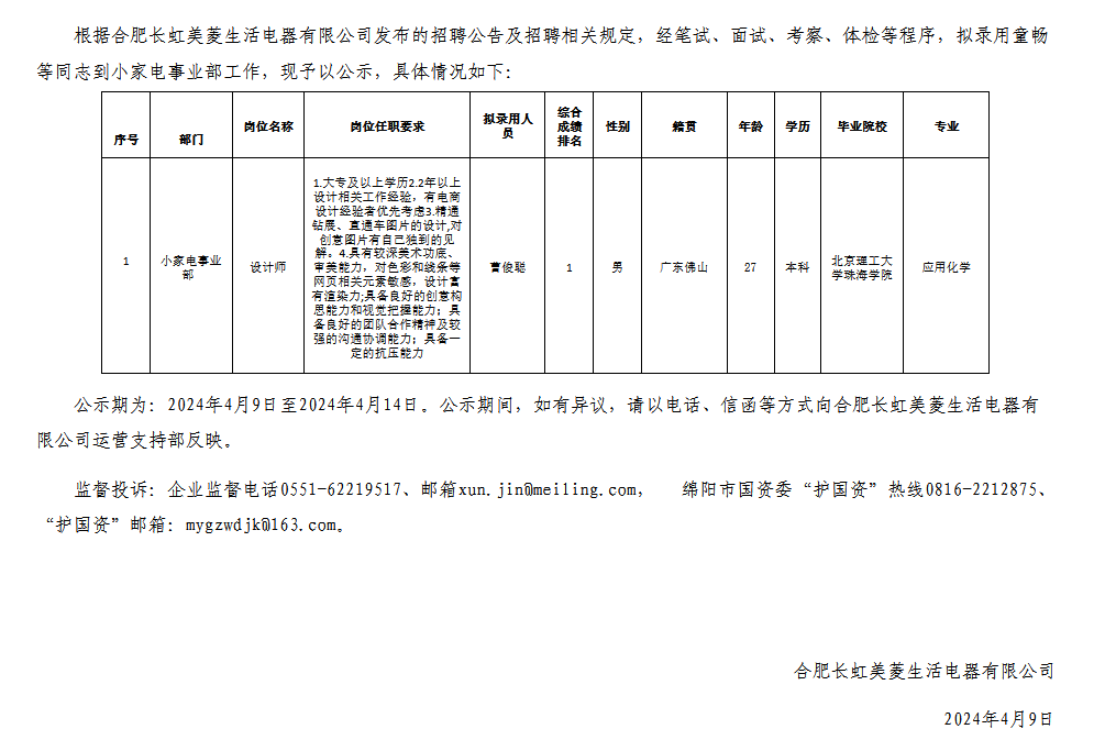 合肥長虹美菱生活電器有限公司關(guān)于招聘設(shè)計師擬錄用人員的公示