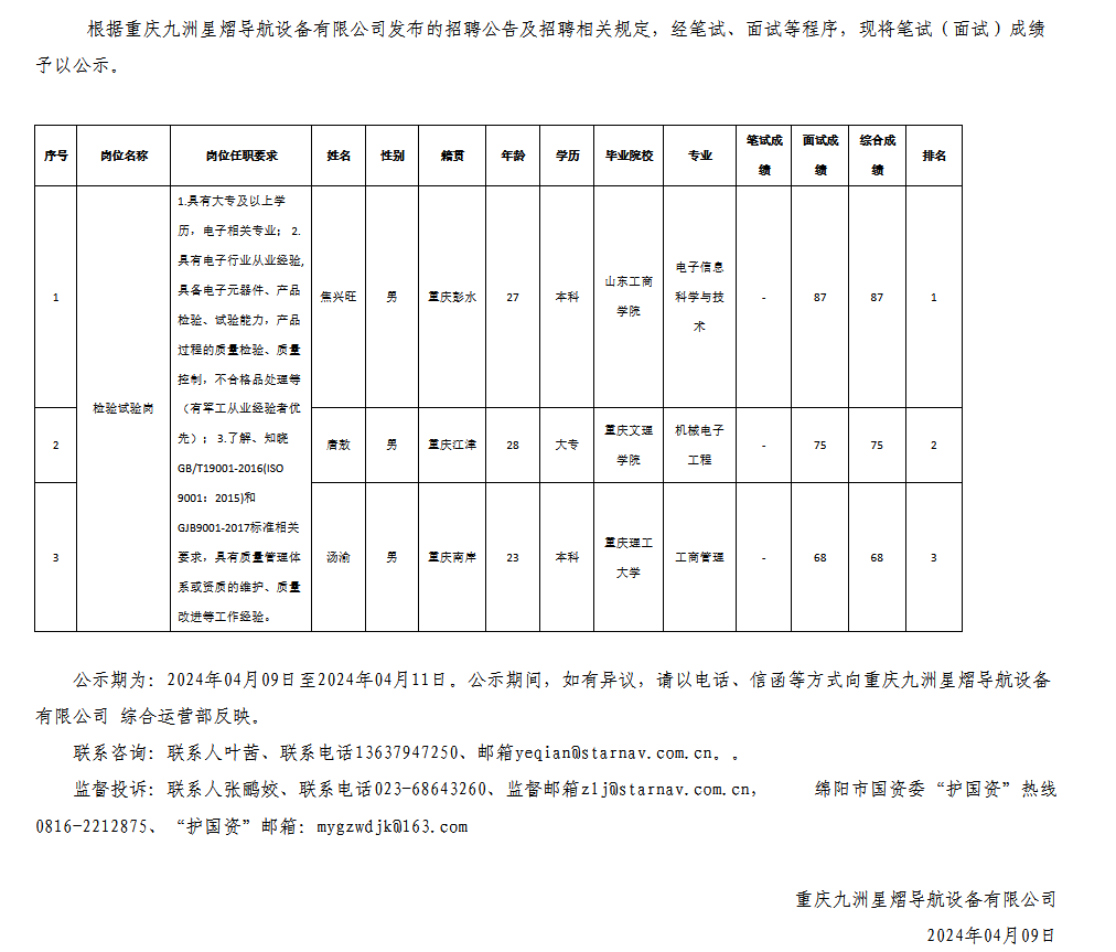 重慶九洲星熠導(dǎo)航設(shè)備有限公司關(guān)于招聘檢驗(yàn)試驗(yàn)崗測(cè)試成績(jī)的公示