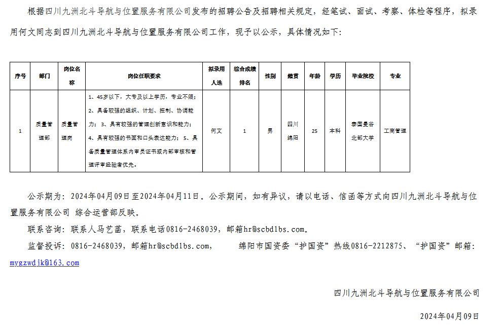 四川九洲北斗導(dǎo)航與位置服務(wù)有限公司關(guān)于招聘質(zhì)量管理崗擬錄用人員的公示