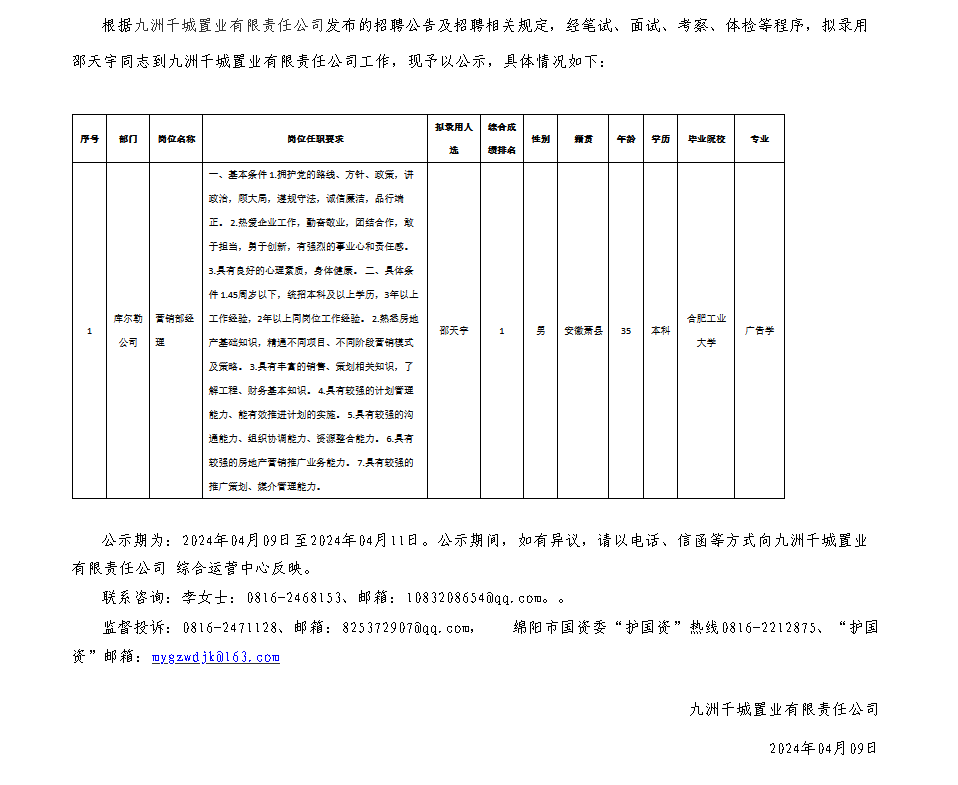 九洲千城置業(yè)有限責任公司關于招聘庫爾勒九洲千城置業(yè)有限責任公司營銷部經理擬錄用人員的公示