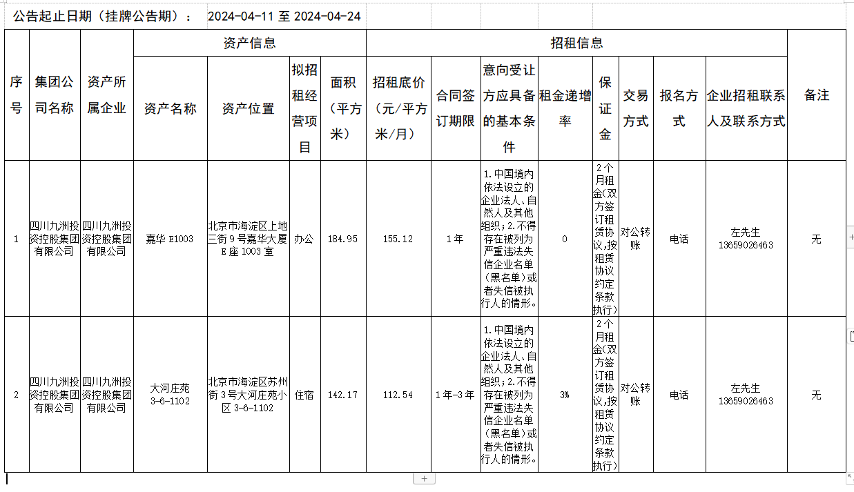 四川九洲投資控股集團(tuán)有限公司資產(chǎn)出租公告