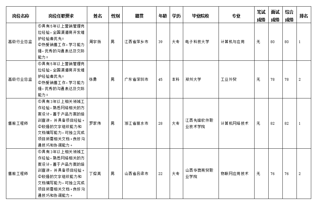 根據(jù)四川長虹佳華信息產(chǎn)品有限責(zé)任公司發(fā)布的招聘公告及招聘相關(guān)規(guī)定,經(jīng)筆試、面試等程序,現(xiàn)將筆試(面試)成績予以公示。