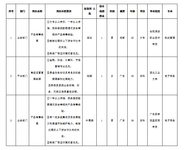 根據(jù)四川長虹佳華信息產(chǎn)品有限責(zé)任公司發(fā)布的招聘公告及招聘相關(guān)規(guī)定,經(jīng)面試、考察、體檢等程序,擬錄用陳劍、柏穎、葉展鵬同志到四川長虹佳華信息產(chǎn)品有限責(zé)任公司工作,現(xiàn)予以公示,具體情況如下: